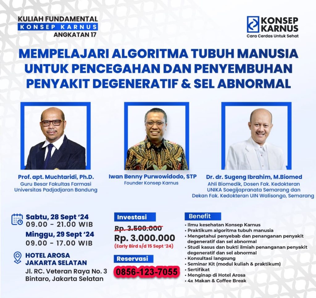 Jika Anda atau ada keluarga yang mengalami penyakit degeneratif Anda wajib ikut Kuliah Konsep Karnus ini